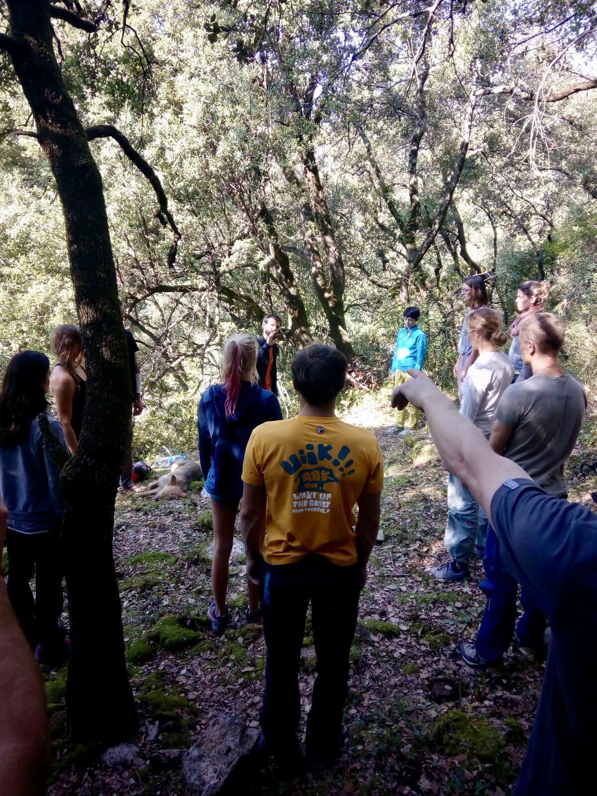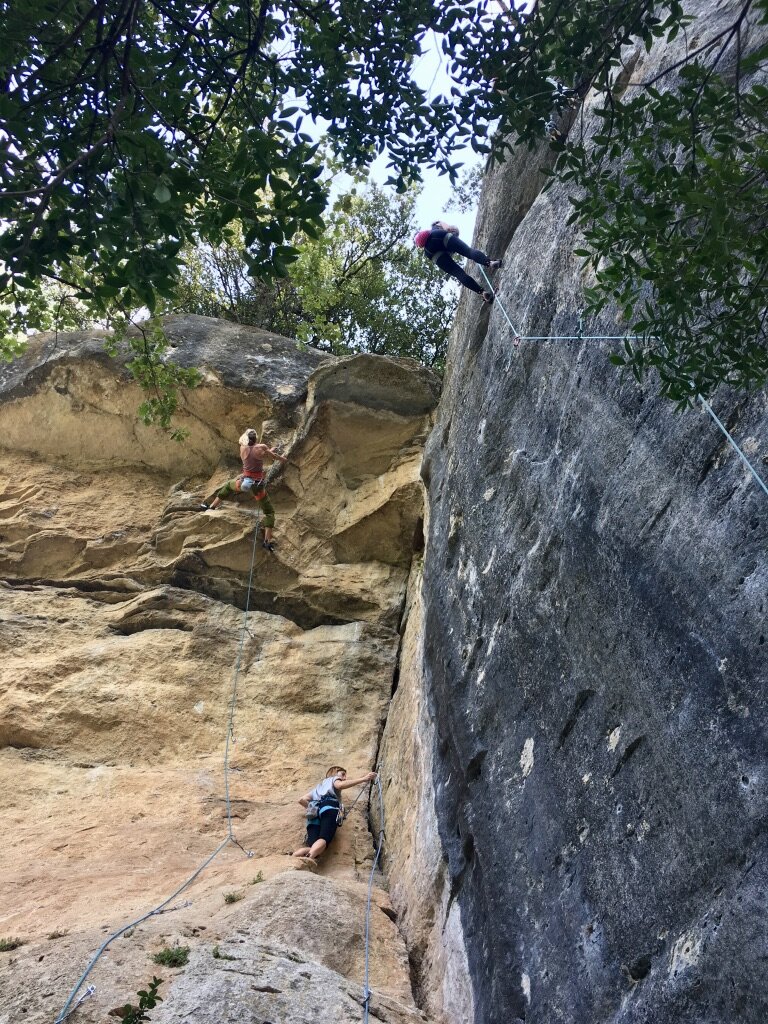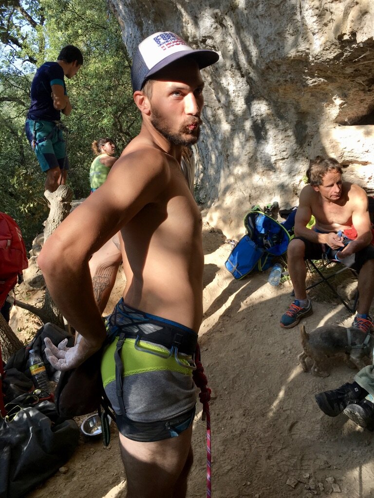 The next day involved climbing at Falaise d’Entrechaux and some climbing oriented workshops. There was a particular climb called Robot Jam, 6c, that there was a competition on. The competition was to complete the climb with as many kneebars as possible, where a kneebar is counted by a handsfree rest for at least 3 seconds. Two bonus kneebars for doing the climb in your underwear and 3 bonus kneebars for doing the climb in the green panties that were, at the moment this was all being explained, dangling from a tree next to the climb.